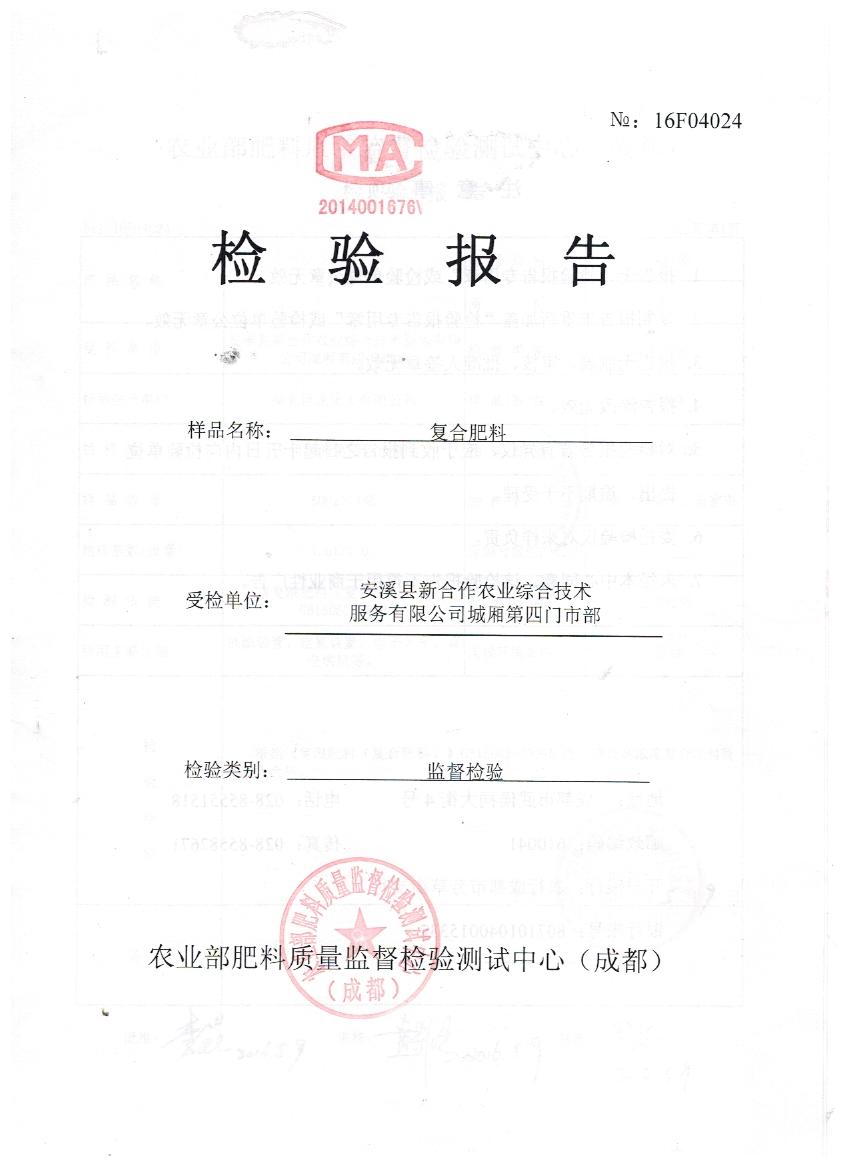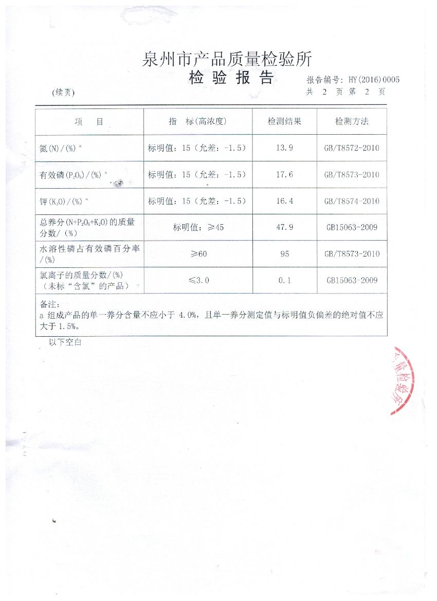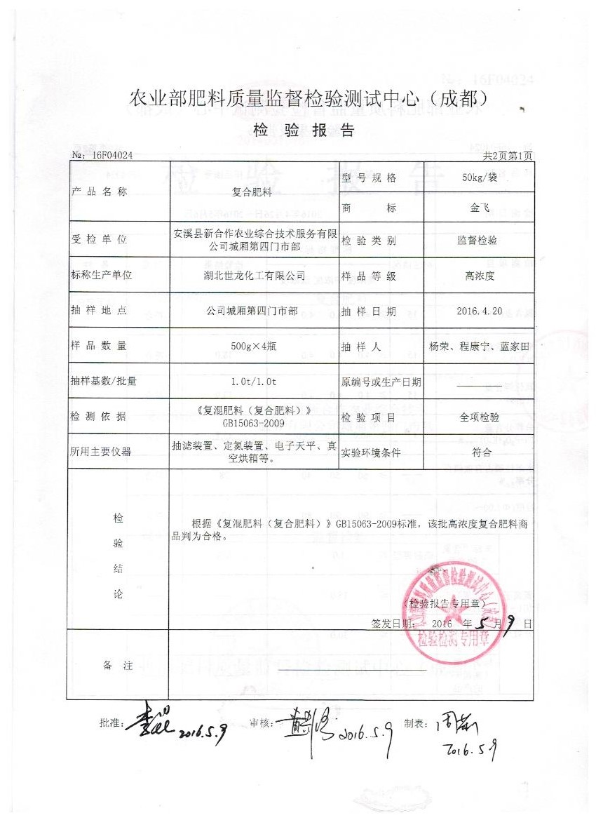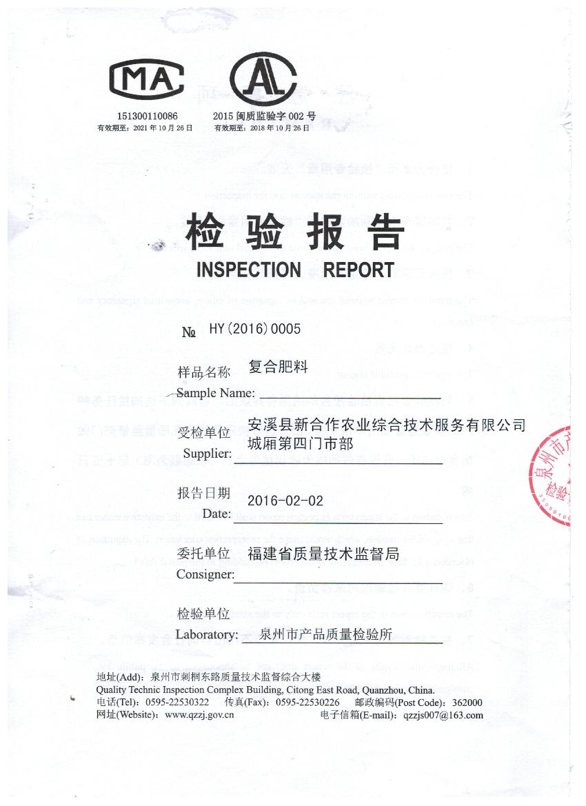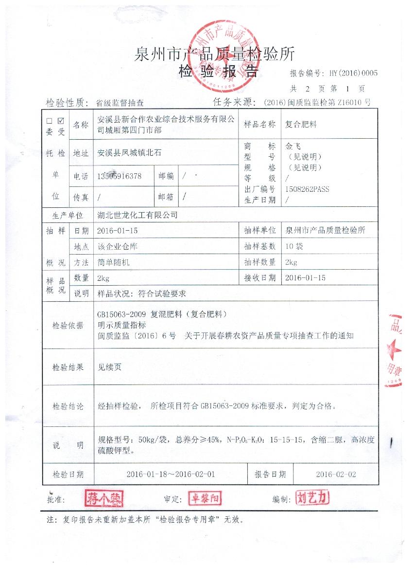 安溪县新合作农业综合技术服务有限公司城厢第四门市部是我公司福建市场终端客户。2016年1月15日被福建省质量技术监督局在福建省开展的2016年春耕农产品质量专项抽查中抽到。众所周知,45%(15-15-15)硫酸钾复合肥是喷浆造粒硫基复合肥中工艺最难的品种,全国各地厂家常因抽检时氮含量不足而屡屡被判定为不合格产品。抽检当天客户心里还是有一丝的担心,可是我们对自己的产品充满信心。果不然,2月2日,我们收到泉州市产品质量检验所寄出的检验报告,金飞复合肥以总养分47.9%,氮13.9%,有效磷17.6,钾16.4%,水溶性磷95%,氯离子质量分数小于0.1%交出了一份超越复合肥国标GB15063-2009的满意答卷。